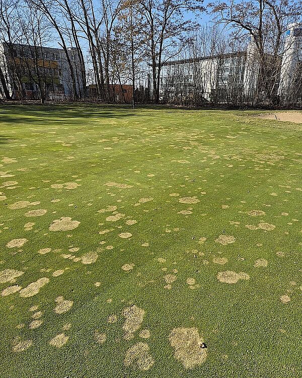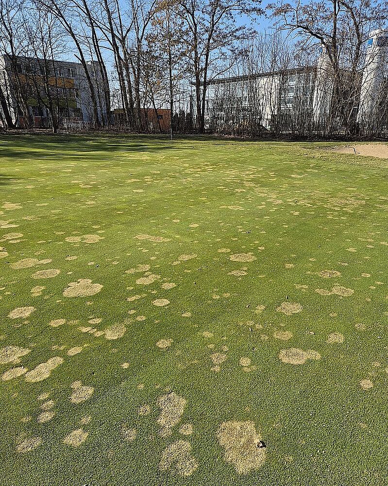 Bei der heutigen Platzbegehung war nach dem Düngen und Kalken der Grüns bereits schon ein leichtes Rasenwachstum erkennbar. Dennoch sind die Schadstellen, die der Schneeschimmel hinterlassen hat, noch immer sehr deutlich sichtbar.