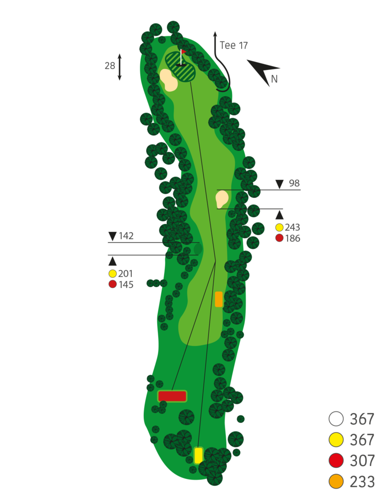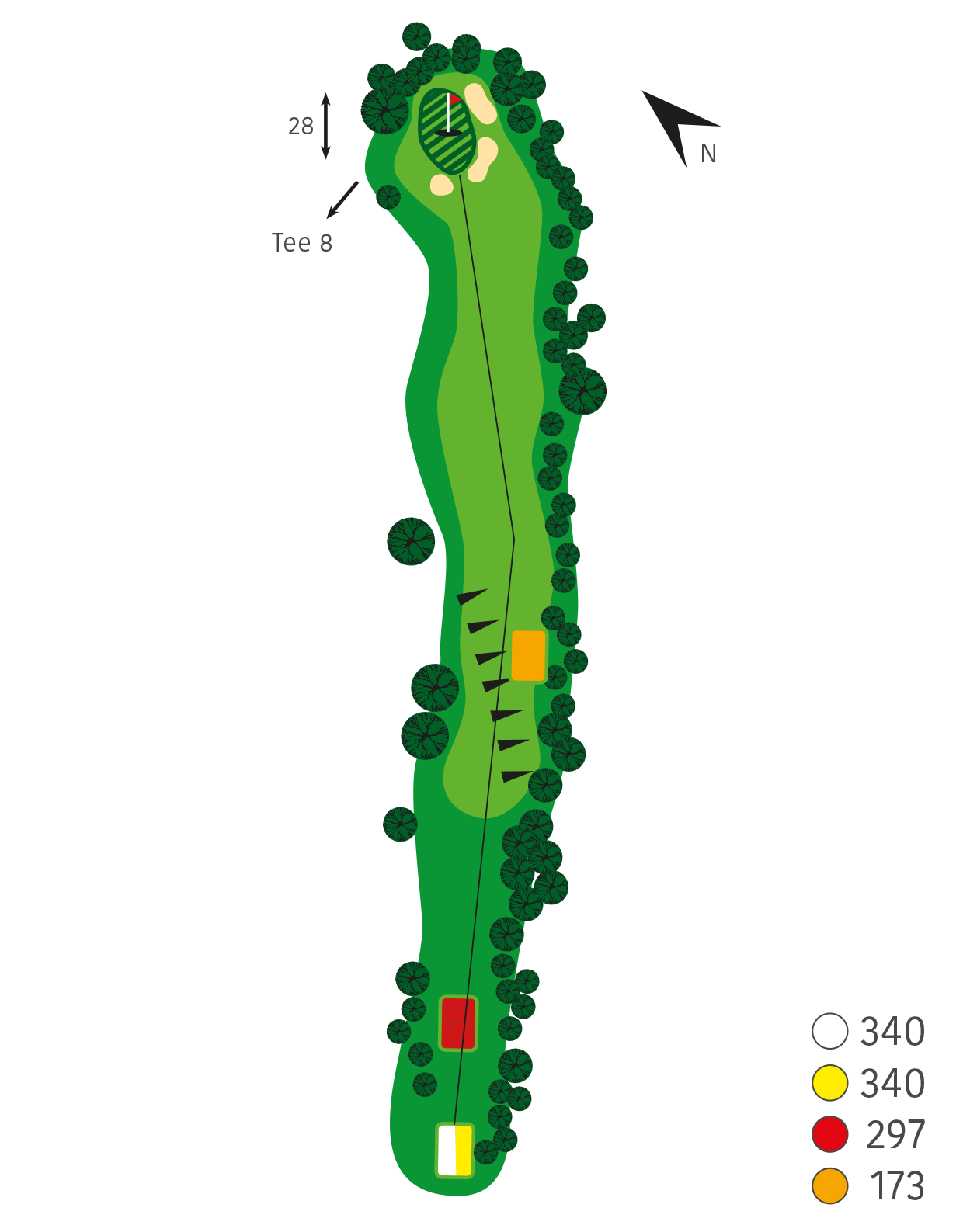 Scratchgolfer: Vermeintlich ein Loch zum Verschnaufen erfordert dieses kurze Par 4 vor allem einen präzisen Abschlag mit einem langen Eisen oder Hybrid. Rechts und links der schmalen Spielbahn verhindern hohe und eng stehenden Bäume ein direktes Grünanspiel. Das erhöht liegende Grün ermöglicht optisch und spielerisch sehr anspruchsvolle Fahnenpositionen.