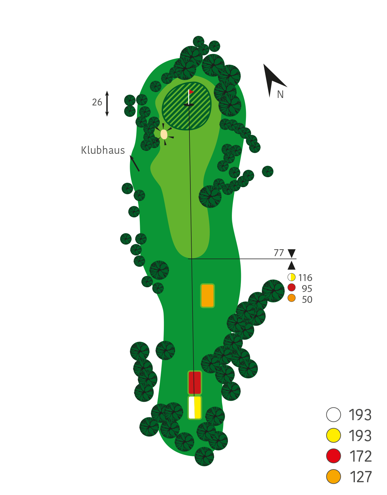 Für die Damen taucht die Baum- Gefahr eher auf der rechten Seite auf. Der 2. Transportschlag kann „sicher“ die 150m-Marke erreichen, um mit dem 3. Schlag auf das Grün zu gelangen. Somit kommt der Fairwaybunker etwa 60 m vor dem Grün gar nicht erst ins Spiel.